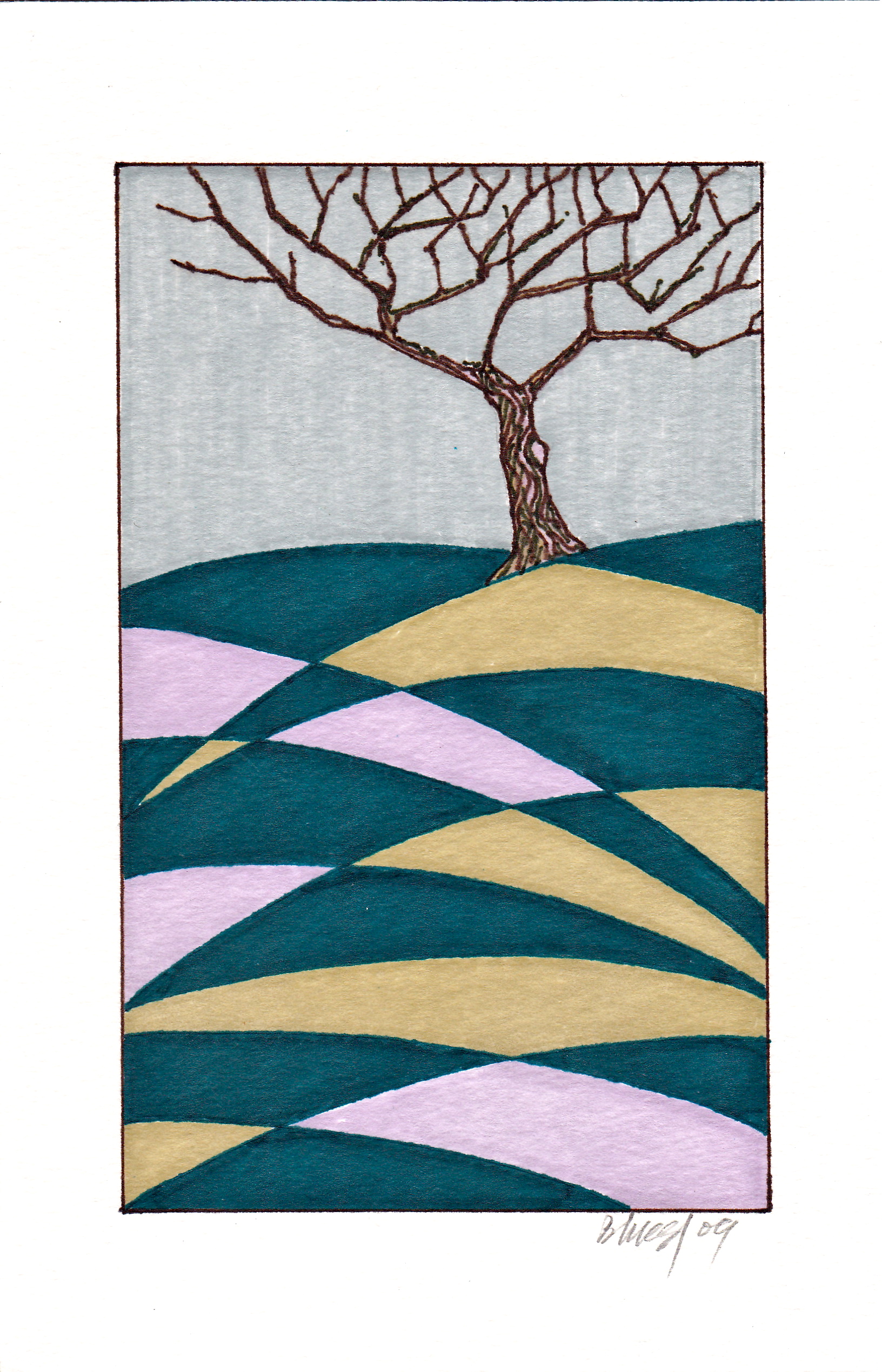 There are pieces that I do to help me meditate. I think of them as visual medication. I try to find some harmony…with some challenge…maybe a shape or a colour…I started years ago after visiting The Dr. Sun Yat Sen Classical Chinese Garden in Vancouver. It wasn’t just peaceful or quiet… it had some quality that raised it and carried it away from the city and time and the day. Every element of the garden had been considered and developed with meaning. It was the first garden I saw that included the sky. I could never reach that insight or enlightenment in my work but I could try to find in some pieces, a way to dream. This piece with its tree and abstract shapes is not intended to be perfect. It’s a suggestion…an invitation to relax and spend some time with it. Look at it…look away…come back…if it reminds you of a time or place or feeling…follow it. I hope it takes you somewhere nice.